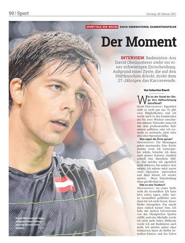 Interview. Badminton-Ass David Obernosterer steht vor einer schwierigen Entscheidung. Aufgrund einer Zyste, die auf den Hüftknochen drückt, droht dem 27-Jährigen das Karriereende.