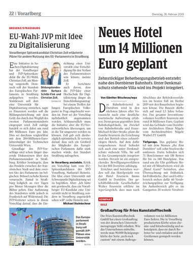 Zehnstöckiger Beherbergungsbetrieb entsteht nahe des Dornbirner Bahnhofs. Unter Denkmalschutz stehende Villa wird ins Projekt integriert.