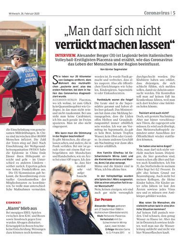Alexander Berger (31) ist Legionär beim italienischen Volleyball-Erstligisten Piacenza und erzählt, wie das Coronavirus das Leben der Menschen in der Region beeinflusst. Von Günter Sagmeister