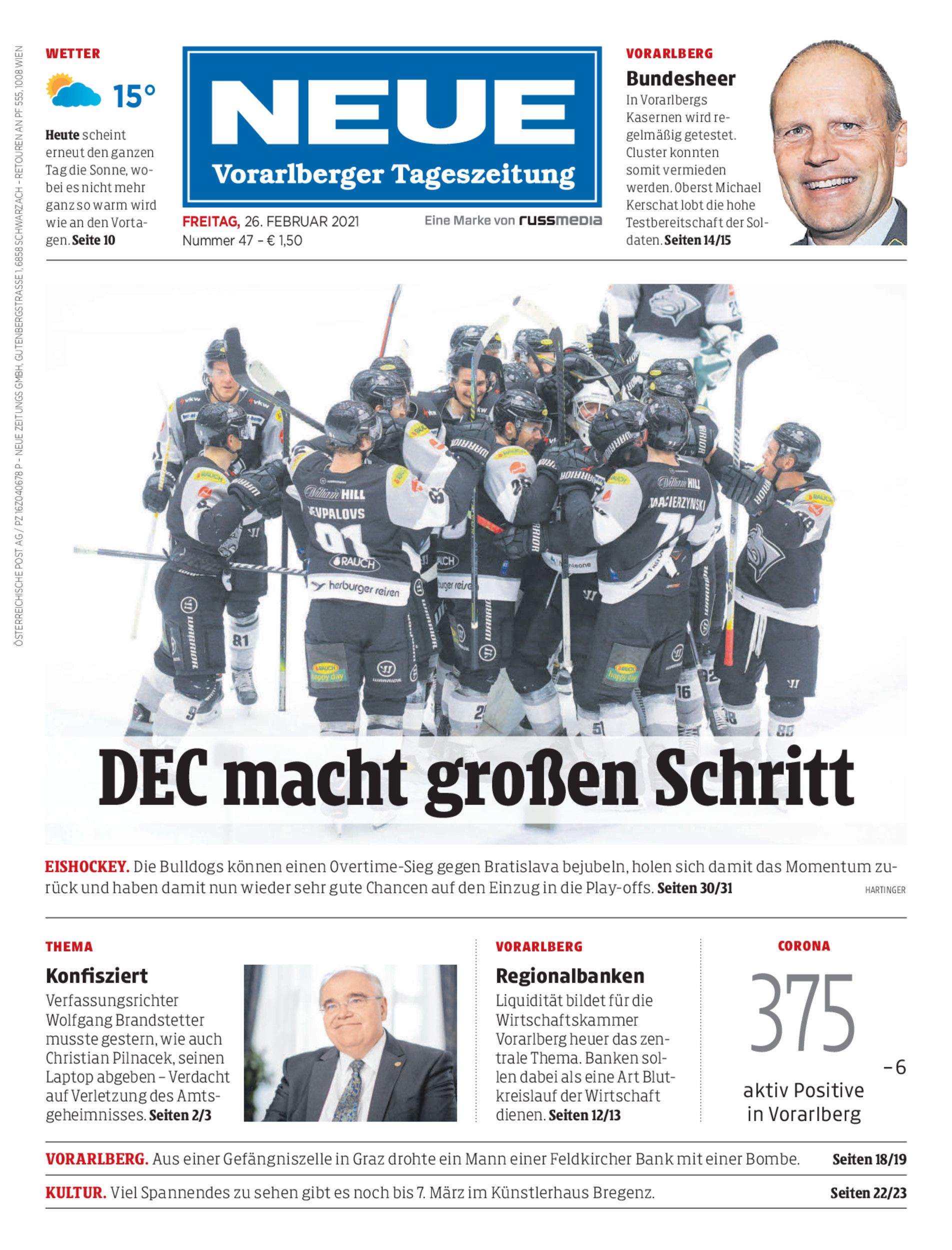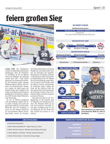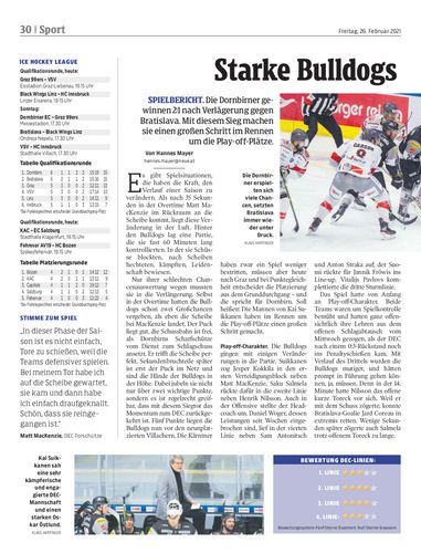 Eishockey. Die Bulldogs können einen Overtime-Sieg gegen Bratislava bejubeln, holen sich damit das Momentum zurück und haben damit nun wieder sehr gute Chancen auf den Einzug in die Play-offs. Seiten 30/31 Hartinger