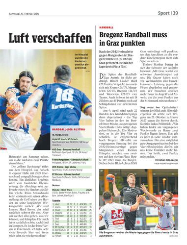 Nach der 29:32-Heimpleite gegen Margareten ist Bregenz HB heute (19 Uhr) in Graz gefordert. Bei Niederlage droht Platz fünf.