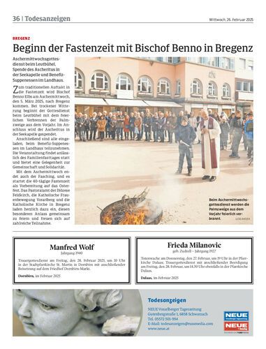 Aschermittwochsgottesdienst beim Leutbühel, Spende des Ascheritus in der Seekapelle und Benefiz-Suppenessen im Landhaus.