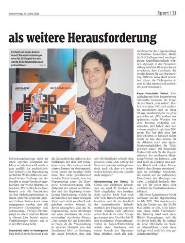 Es hätte das erste Mehrkampf-Meeting für Alexandra Giesinger als neue Präsidentin des OK-Teams werden sollen, doch auch das Stelldichein der Weltklasse im Möslestadion fällt dem Virus zum Opfer.