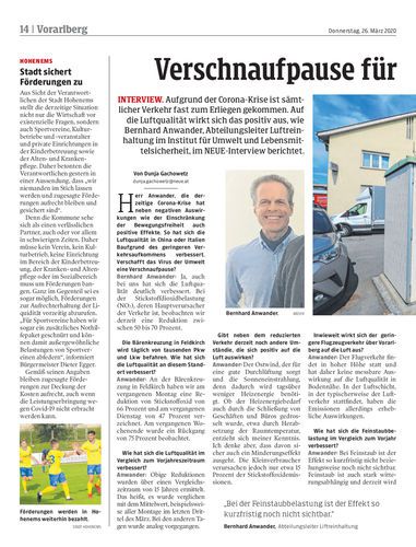 Interview. Aufgrund der Corona-Krise ist sämtlicher Verkehr fast zum Erliegen gekommen. Auf die Luftqualität wirkt sich das positiv aus, wie Bernhard Anwander, Abteilungsleiter Luftreinhaltung im Institut für Umwelt und Lebensmittelsicherheit, im NEUE-Interview berichtet.