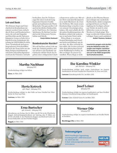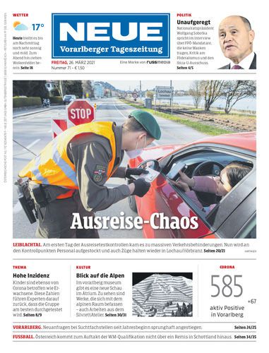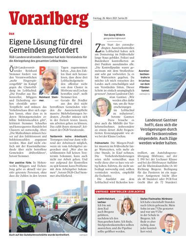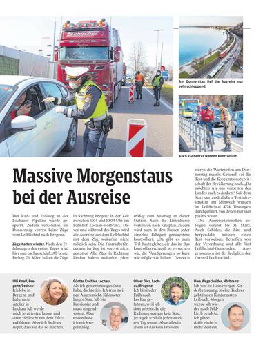 Leiblachtal. Am ersten Tag der Ausreisetestkontrollen kam es zu massiven Verkehrsbehinderungen. Nun wird an den Kontrollpunkten Personal aufgestockt und auch Züge halten wieder in Lochau/Hörbranz. Seiten 20/21 Hartinger