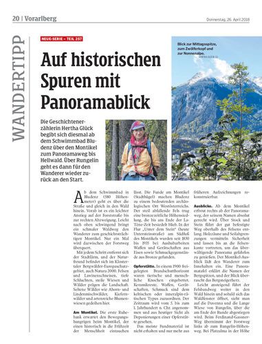 Die Geschichtenerzählerin Hertha Glück begibt sich diesmal ab dem Schwimmbad Bludenz über den Montikel zum Panoramaweg bis Hellwald. Über Rungelin geht es dann für den Wanderer wieder zurück an den Start.