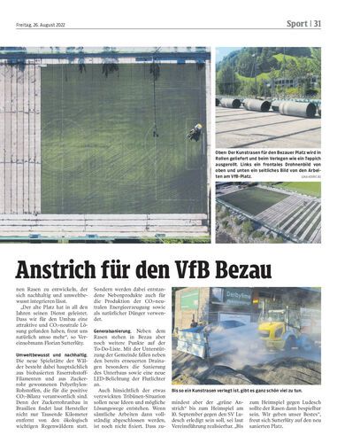 Die Bezauer Auto-Gemo-Arena wird seit dem 10. August saniert. Die Heimstätte des VfB Bezau entwickelt sich dabei zum ersten C02-neutralen Kunstrasenplatz Österreichs.