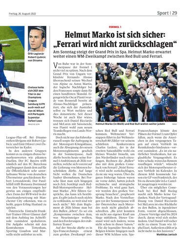 Am Sonntag steigt der Grand Prix in Spa. Helmut Marko erwartet weiter einen WM-Zweikampf zwischen Red Bull und Ferrari.