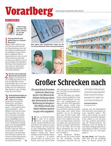 Bregenz. Ein Geisteskranker (24) verletzte Dienstagnacht in einer Wohnanlage vier Menschen mit einem Messer. Einige Nachbarn hörten Hilfeschreie. Was wirklich passiert war, erfuhren die meisten erst am nächsten Tag. Seiten 16/17 Mittelberger