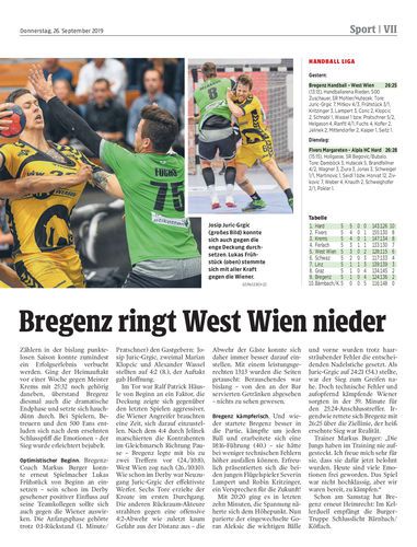 Nach vier Niederlagen schafft Bregenz im Nachtrag der fünften Runde gegen West Wien mit 26:25 (13:13) den ersten Saisonsieg.