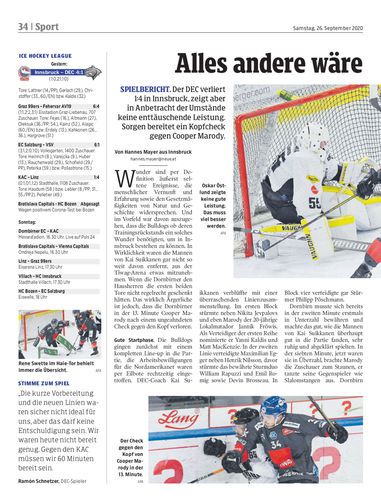 Spielbericht. Der DEC verliert 1:4 in Innsbruck, zeigt aber in Anbetracht der Umstände keine enttäuschende Leistung. Sorgen bereitet ein Kopfcheck gegen Cooper Marody.