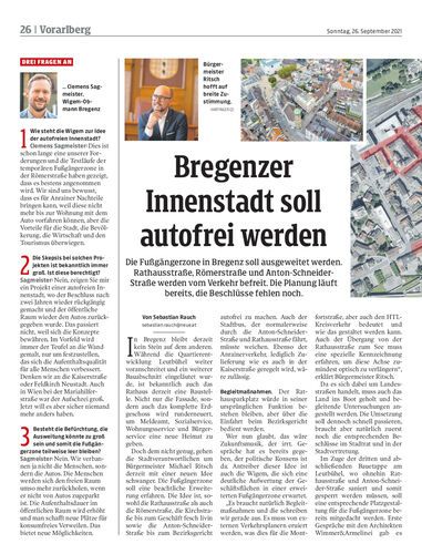 Die Fußgängerzone in Bregenz soll ausgeweitet werden. Rathausstraße, Römerstraße und Anton-Schneider-Straße werden vom Verkehr befreit. Die Planung läuft bereits, die Beschlüsse fehlen noch.