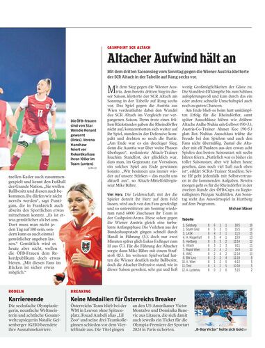 Mit dem dritten Saisonsieg vom Sonntag gegen die Wiener Austria kletterte der SCR Altach in der Tabelle auf Rang sechs vor.