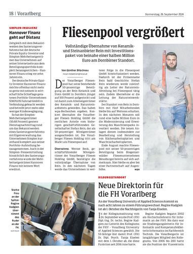 Vollständige Übernahme von Keramik- und Steinanbieter Rein mit Investitionspaket von beinahe einer halben Million Euro am Dornbirner Standort.