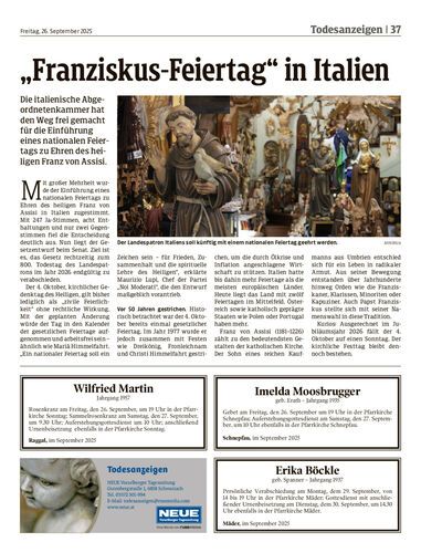 Die italienische Abgeordnetenkammer hat den Weg frei gemacht für die Einführung eines nationalen Feiertags zu Ehren des heiligen Franz von Assisi.