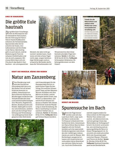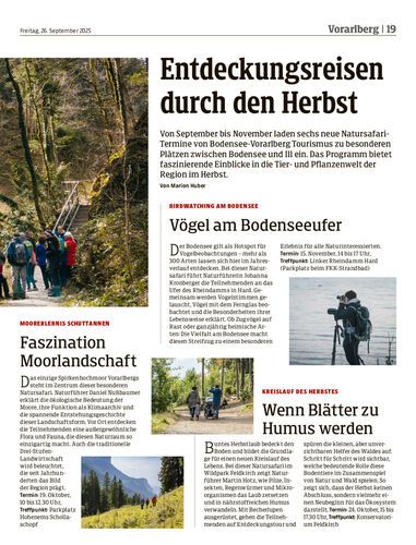 Von September bis November laden sechs neue Natursafari-Termine von Bodensee-Vorarlberg Tourismus zu besonderen Plätzen zwischen Bodensee und Ill ein. Das Programm bietet faszinierende Einblicke in die Tier- und Pflanzenwelt der Region im Herbst.