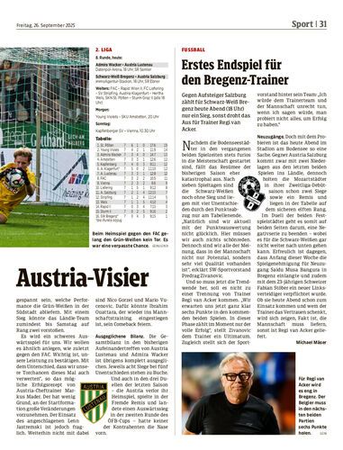 Gegen Aufsteiger Salzburg zählt für Schwarz-Weiß Bregenz heute Abend (18 Uhr) nur ein Sieg, sonst droht das Aus für Trainer Regi van Acker.