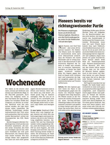 Die Pioneers empfangen heute um 19.30 Uhr die Vienna Capitals. Obwohl es erst die Fünftrundenpartie ist, steht für die Feldkircher viel auf dem Spiel.