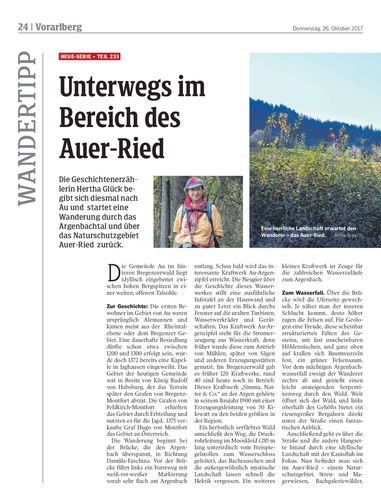 Die Geschichtenerzählerin Hertha Glück begibt sich diesmal nach Au und startet eine Wanderung durch das Argenbachtal und über das Naturschutzgebiet Auer-Ried zurück.