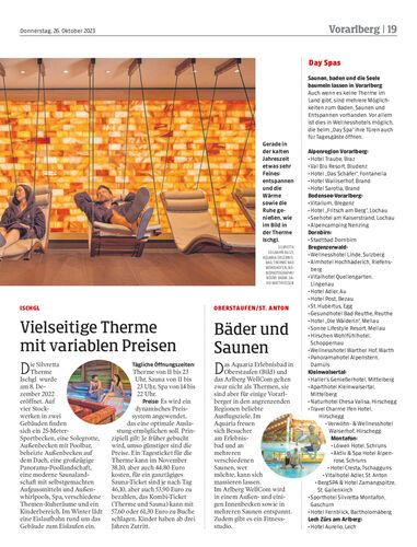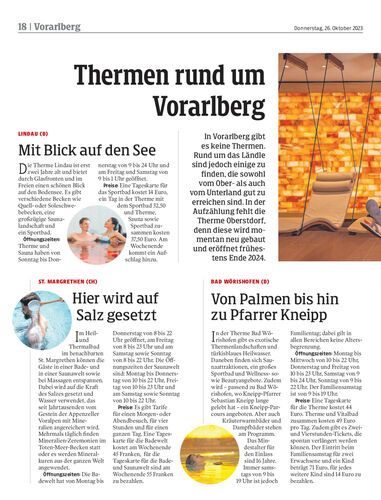 In Vorarlberg gibt es keine Thermen. Rund um das Ländle sind jedoch einige zu finden, die sowohl vom Ober- als auch vom Unterland gut zu erreichen sind. In der Aufzählung fehlt die Therme Oberstdorf, denn diese wird momentan neu gebaut und eröffnet frühestens Ende 2024.
