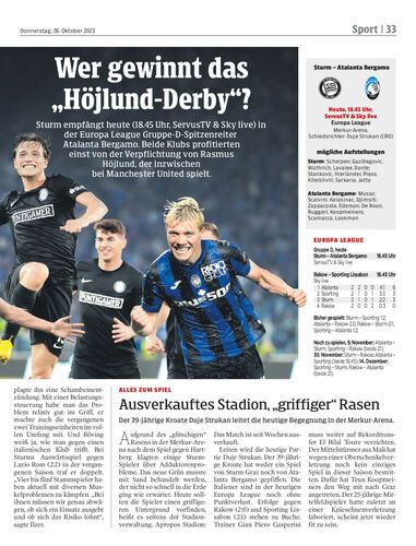 Sturm empfängt heute (18.45 Uhr, Servus TV & Sky live) in der Europa League Gruppe-D-Spitzenreiter Atalanta Bergamo. Beide Klubs profitierten einst von der Verpflichtung von Rasmus Höjlund, der inzwischen bei Manchester United spielt.