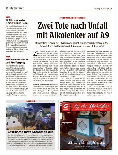 Bei der Kollision in der Steiermark geriet ein ungarischer Pkw in Vollbrand. Auch in Oberösterreich kam es zu einem Alko-Unfall.