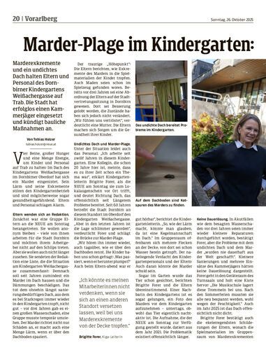 Marderexkremente und ein undichtes Dach halten Eltern und Personal des Dornbirner Kindergartens Weißachergasse auf Trab. Die Stadt hat erfolglos einen Kammerjäger eingesetzt und kündigt bauliche Maßnahmen an.