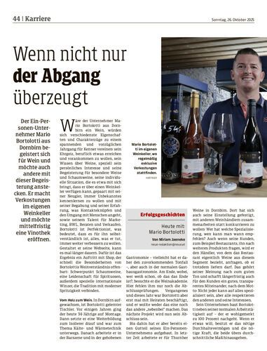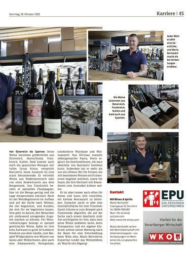 Der Ein-Personen-Unternehmer Mario Bortolotti aus Dornbirn begeistert sich für Wein und möchte auch andere mit dieser Begeisterung anstecken. Er macht Verkostungen im eigenen Weinkeller und möchte mittelfristig eine Vinothek eröffnen.