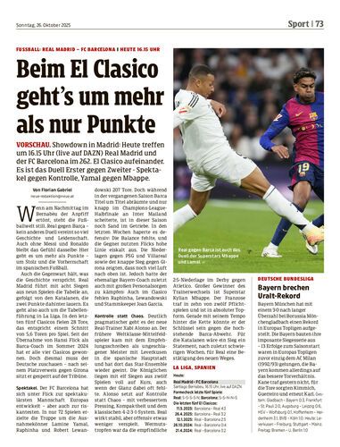 Vorschau. Showdown in Madrid: Heute treffen um 16.15 Uhr (live auf DAZN) Real Madrid und der FC Barcelona im 262. El Clasico aufeinander. Es ist das Duell Erster gegen Zweiter - Spektakel gegen Kontrolle, Yamal gegen Mbappe.
