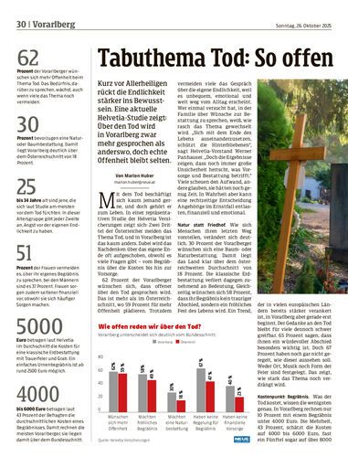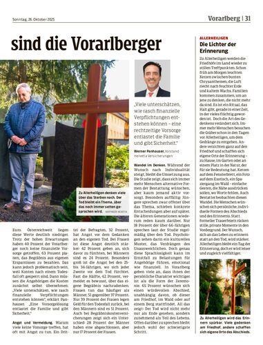 Kurz vor Allerheiligen rückt die Endlichkeit stärker ins Bewusstsein. Eine aktuelle Helvetia-Studie zeigt: Über den Tod wird in Vorarlberg zwar mehr gesprochen als anderswo, doch echte Offenheit bleibt selten.