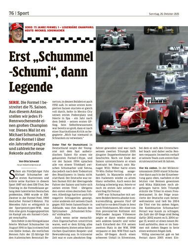 Serie. Die Formel 1 bestreitet die 75. Saison. Aus diesem Anlass stellen wir jedes F1-Rennwochenende einen großen Champion vor. Dieses Mal ist es Michael Schumacher, der die Formel 1 über ein Jahrzehnt prägte und zahlreiche neue Rekorde aufstellte.