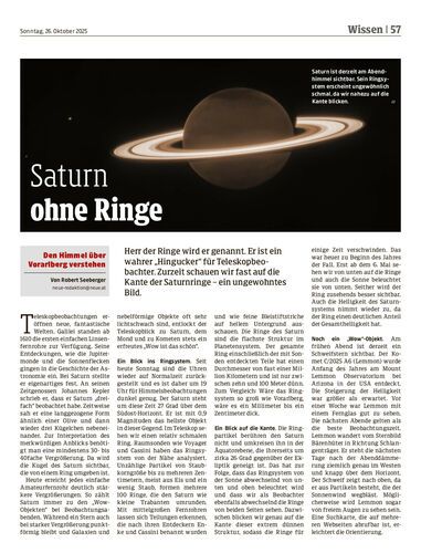 Herr der Ringe wird er genannt. Er ist ein wahrer „Hingucker“ für Teleskopbeobachter. Zurzeit schauen wir fast auf die Kante der Saturnringe – ein ungewohntes Bild.