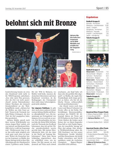Ex-Weltmeisterin Adriana Mathis holt bei der Heim-WM der Kunstradsportlerinnen in Dornbirn Bronze. Dies war bei überragenden Vorstellungen der Deutschen das Maximum.