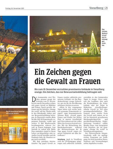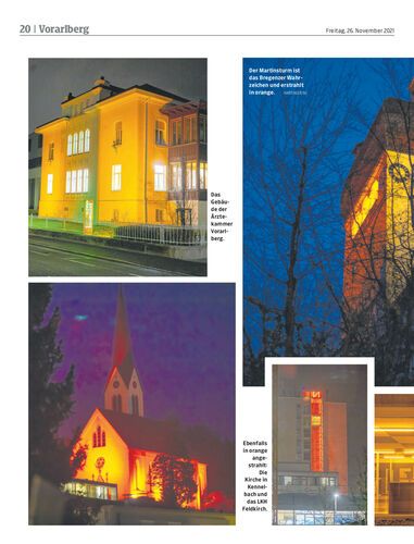 Bis zum 10. Dezember erstrahlen prominente Gebäude in Vorarlberg orange. Ein Zeichen, das zur Bewusstseinsbildung beitragen soll.
