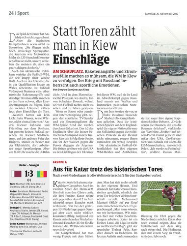 Am Schauplatz. Raketenangriffe und Stromausfälle machen es mühsam, die WM in Kiew zu verfolgen. Der Krieg mit Russland beherrscht auch sportliche Emotionen. Von Dmytro Durnjew aus Kiew