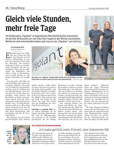 Im Frisörsalon „Figolant“ in Egg können Mitarbeiterinnen aussuchen, ob sie ihre 40 Stunden an vier oder fünf Tagen in der Woche einarbeiten. Wofür sie sich entschieden haben und was es mit „Figolant“ auf sich hat.