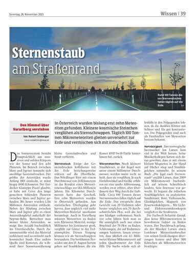 In Österreich wurden bislang erst zehn Meteoriten gefunden. Kleinere kosmische Steinchen verglühen als Sternschnuppen. Täglich 100 Tonnen Mikrometeoriten gleiten unversehrt zur Erde und vermischen sich mit irdischem Staub.