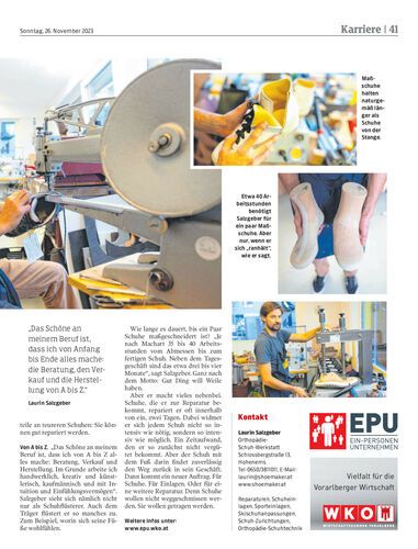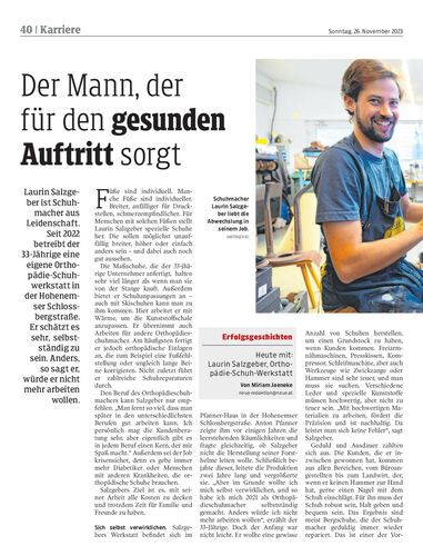 Laurin Salzgeber ist Schuhmacher aus Leidenschaft. Seit 2022 betreibt der 33-Jährige eine eigene Orthopädie-Schuhwerkstatt in der Hohenemser Schlossbergstraße. Er schätzt es sehr, selbstständig zu sein. Anders, so sagt er, würde er nicht mehr arbeiten wollen.