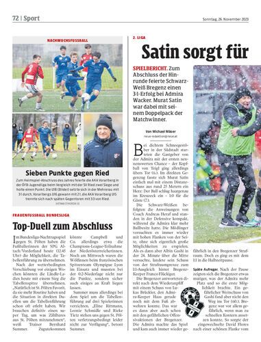 Spielbericht. Zum Abschluss der Hinrunde feierte Schwarz-Weiß Bregenz einen 3:1-Erfolg bei Admira Wacker. Murat Satin war dabei mit seinem Doppelpack der Matchwinner.