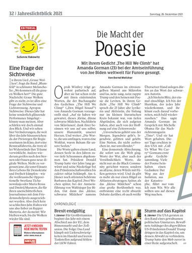 Mit ihrem Gedicht „The Hill We Climb“ hat Amanda Gorman (23) bei der Amtseinführung von Joe Biden weltweit für Furore gesorgt. Von Bernd Melichar