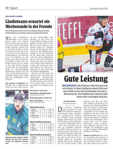 Der EC Bregenzerwald wird in der Master Round bei den Zeller Eisbären vorstellig, Lustenau spielt beim KAC II.