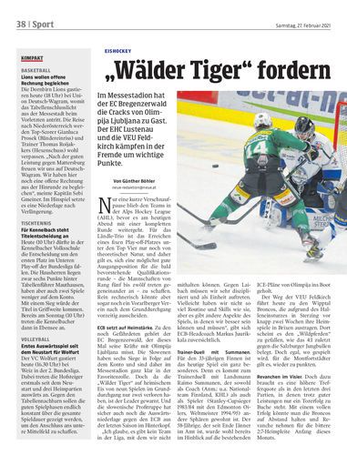 Im Messestadion hat der EC Bregenzerwald die Cracks von Olimpija Ljubljana zu Gast. Der EHC Lustenau und die VEU Feldkirch kämpfen in der Fremde um wichtige Punkte.