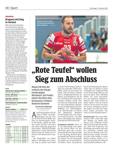 Heute (18 Uhr) Abschluss der Hauptrunde gegen Bärnbach. Ein Punkt reicht für Platz drei. Krsmancic verlässt Hard im Sommer.