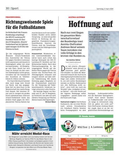 Im Kellerduell der Frauen-Bundesliga empfängt die SPG FC Lustenau/FC Dornbirn heute (15 Uhr) den FC Bergheim, Altach/Vorderland hat im Spitzenspiel morgen (12.45 Uhr) die Vienna zu Gast.
