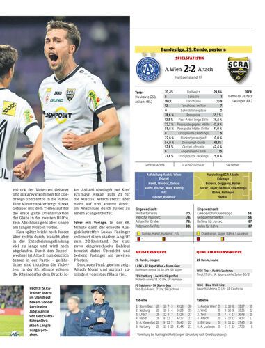 Spielbericht. Der SCR Altach holt zwei Mal einen Rückstand auf und erkämpft sich beim 2:2 spät einen Punkt bei der Wiener Austria. Den Treffer zum Punkgewinn macht Fadinger in der 88. Minute.
