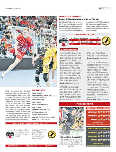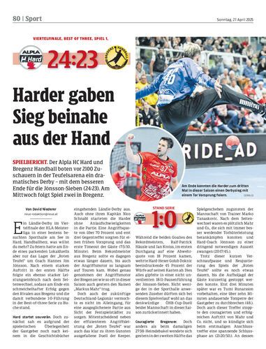 Spielbericht. Der Alpla HC Hard und Bregenz Handball boten vor 2100 Zuschauern in der Teufelsarena ein dramatisches Derby – mit dem besseren Ende für die Jónsson-Sieben (24:23). Am Mittwoch folgt Spiel zwei in Bregenz.