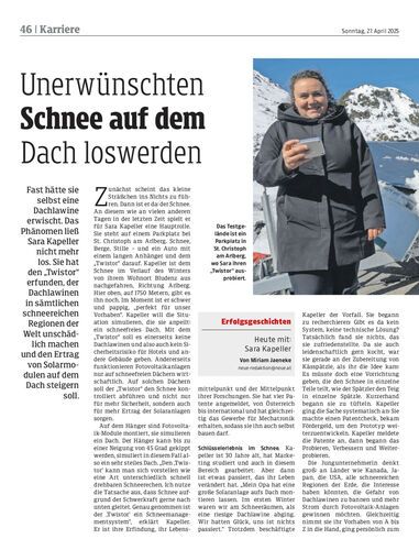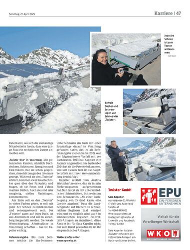 Fast hätte sie selbst eine Dachlawine erwischt. Das Phänomen ließ Sara Kapeller nicht mehr los. Sie hat den „Twistor“ erfunden, der Dachlawinen in sämtlichen schneereichen Regionen der Welt unschädlich machen und den Ertrag von Solarmodulen auf dem Dach steigern soll.
