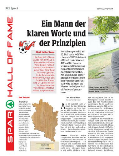 Horst Lumper wird am 20. Mai nach 1001 Wochen als VFV-Präsident offiziell zurücktreten. Alfons Kirchmann wurde am Donnerstag zum interimistischen Nachfolger gewählt. Als Würdigung seiner großen Verdienste um den Vorarlberger Fußball wird Lumper als Vierter in die Spar Hall of Fame aufgenommen.