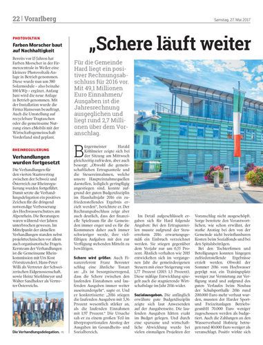 Für die Gemeinde Hard liegt ein positiver Rechnungsabschluss für 2016 vor. Mit 49,1 Millionen Euro Einnahmen/Ausgaben ist die Jahresrechnung ausgeglichen und liegt rund 2,7 Millionen über dem Voranschlag.