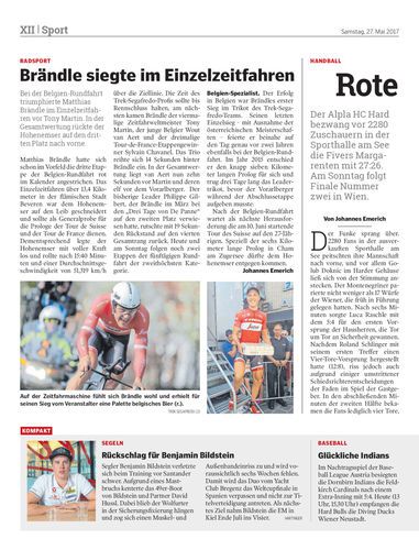 Bei der Belgien-Rundfahrt triumphierte Matthias Brändle im Einzelzeitfahren vor Tony Martin. In der Gesamtwertung rückte der Hohenemser auf den dritten Platz nach vorne.